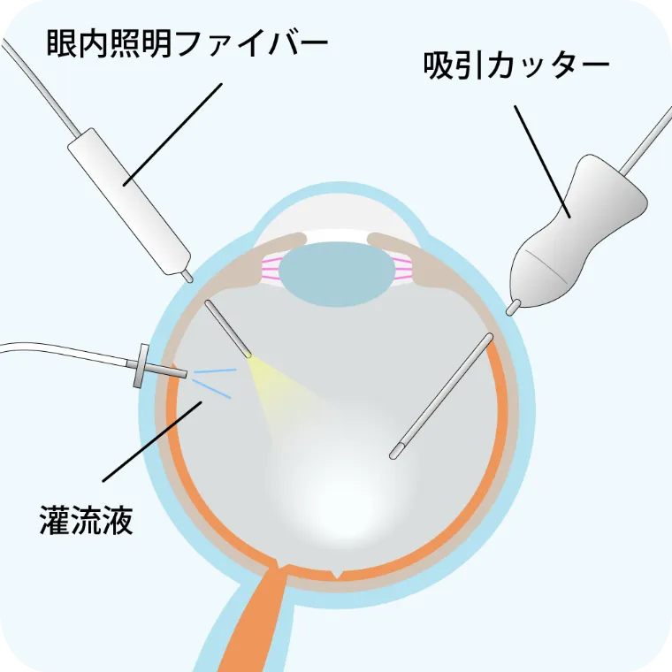 硝子体手術は、病気の原因となっている硝子体の混濁・出血・牽引を取り除き、網膜を正常な状態に整えることを目的としています。